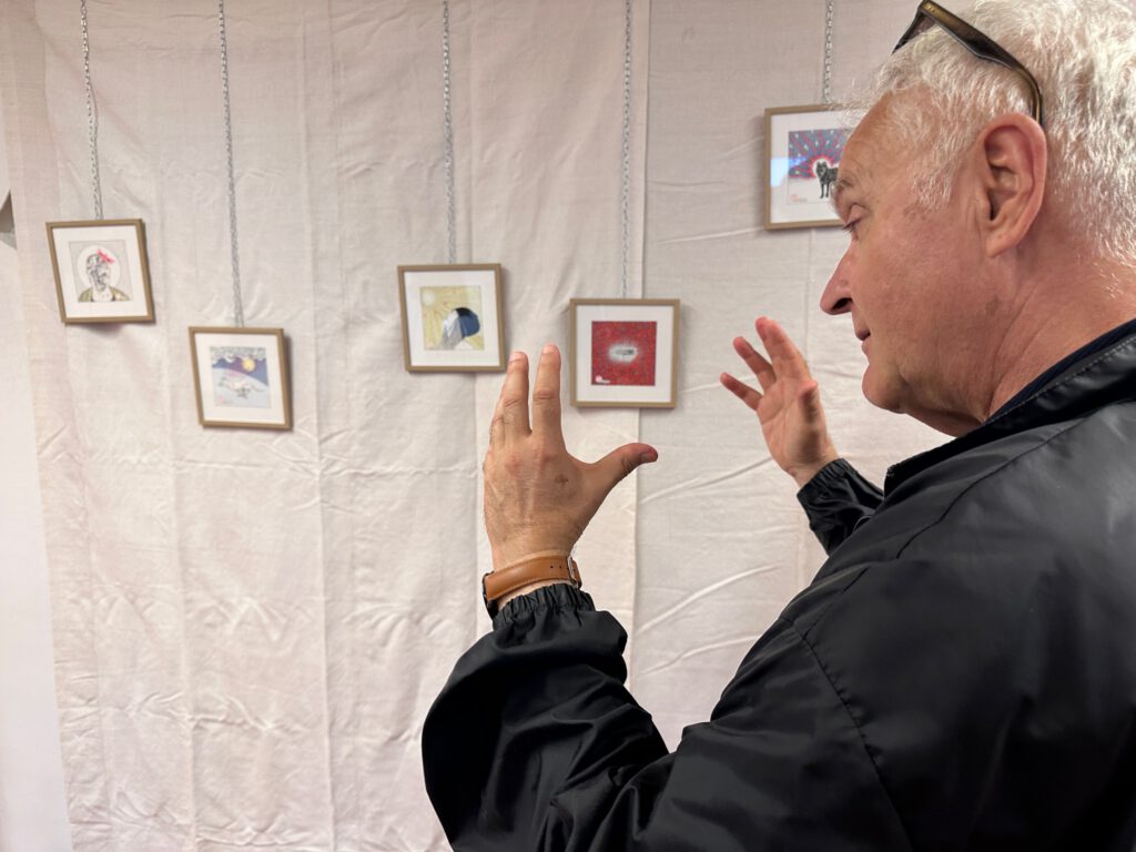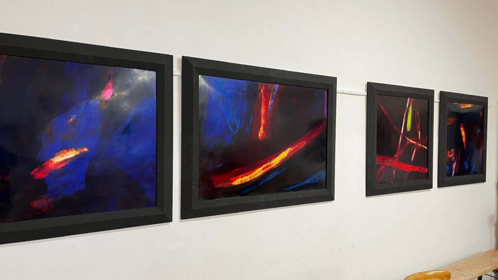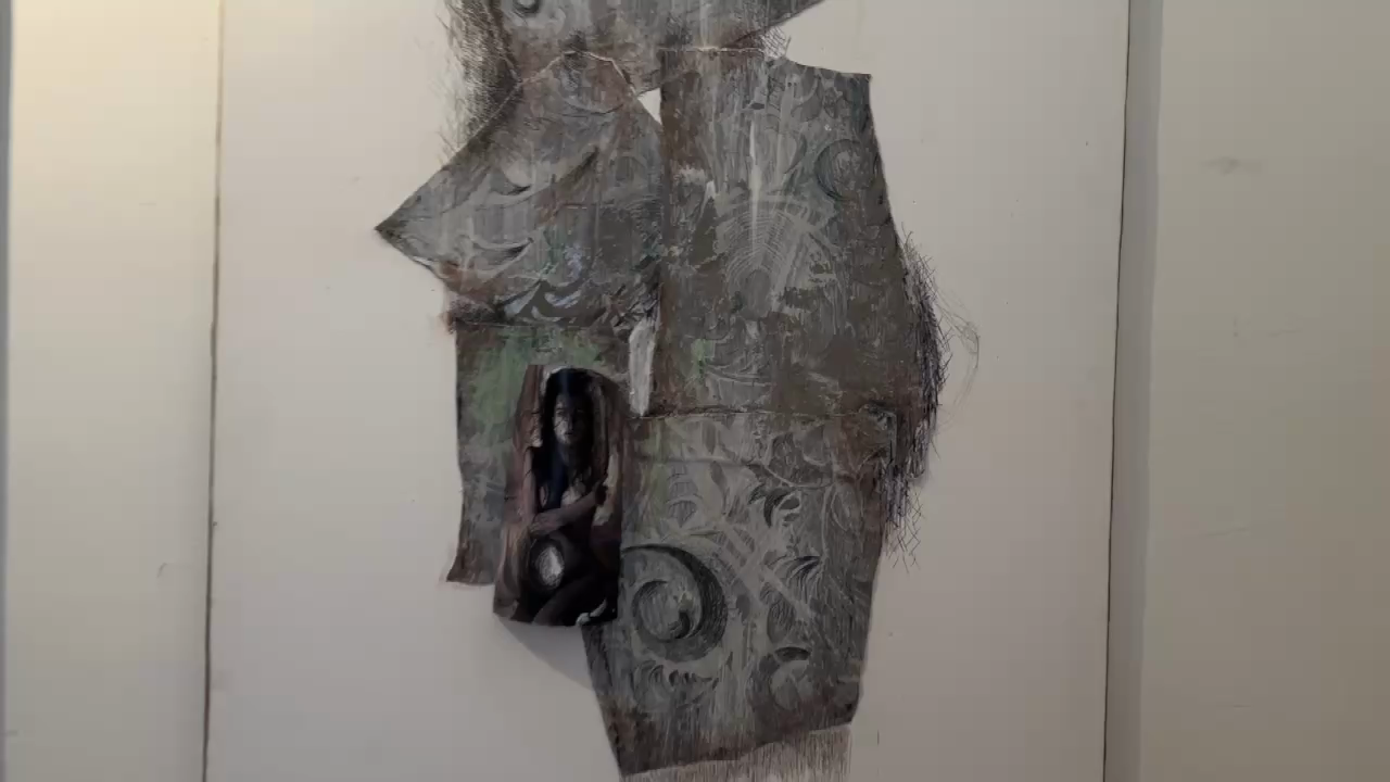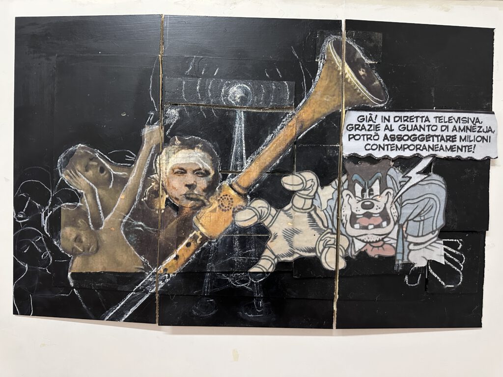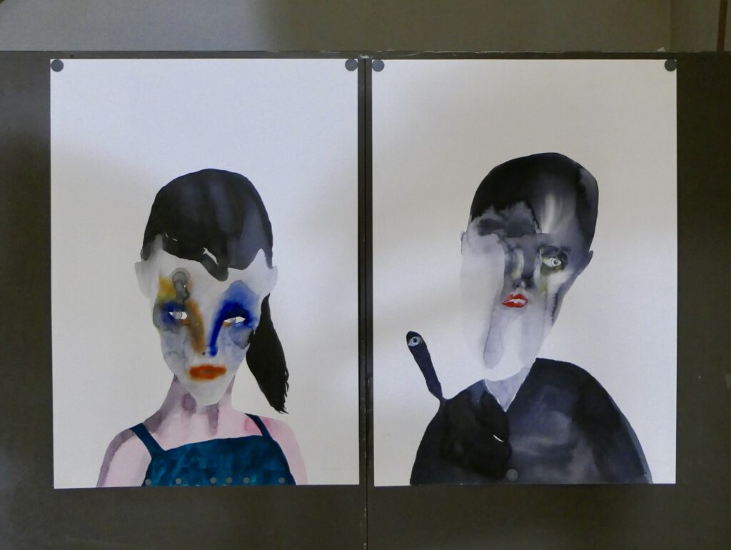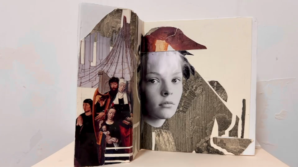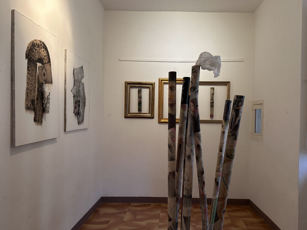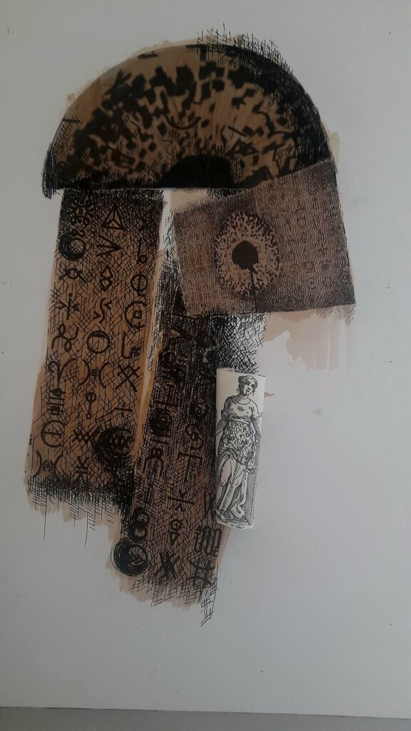 Collagen, Überzeichnungen, Klebungen, die den Raum ins Bild mit einbeziehen.