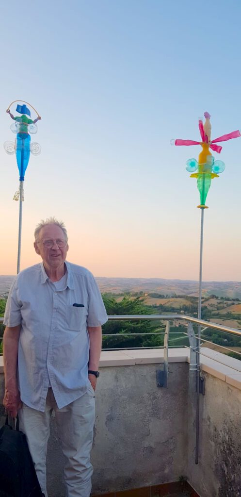Upcycling Kunst aus Müll. Windspiele auf dem Balkon des Pfarrhauses.
