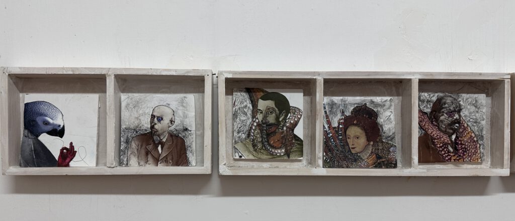 Collagen, Mensch-Tier-Kreaturen. Drucke aus verschiedenen Epochen vereinigen sich und schaffen damit Neues.